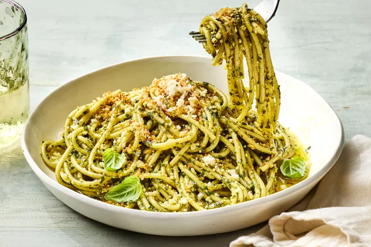 A twist on the Genovese staple. Toasted panko breadcrumbs add a fantastic crunch instead of pine nuts, making it nut-free and budget-friendly.