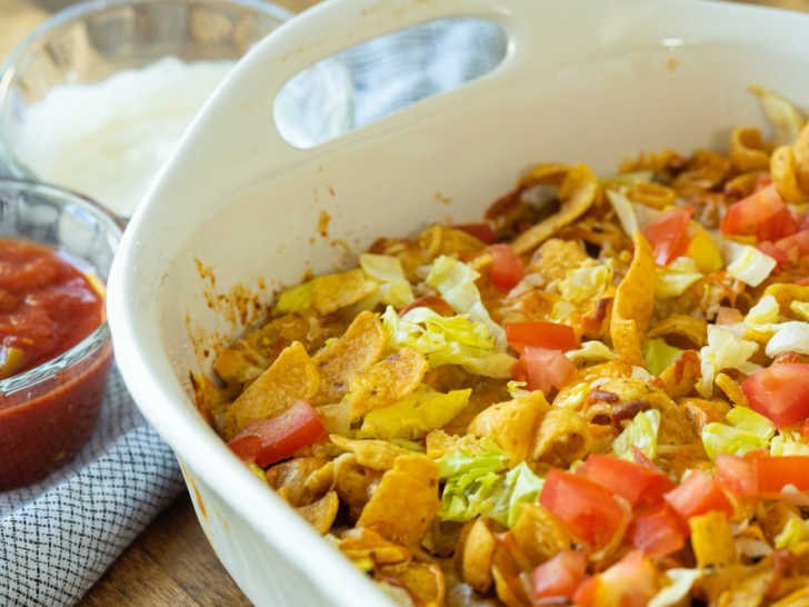 Key Ingredients: Ground beef, taco seasoning, tortillas or tortilla chips, black beans, corn, salsa, enchilada sauce, Monterey Jack cheese.
