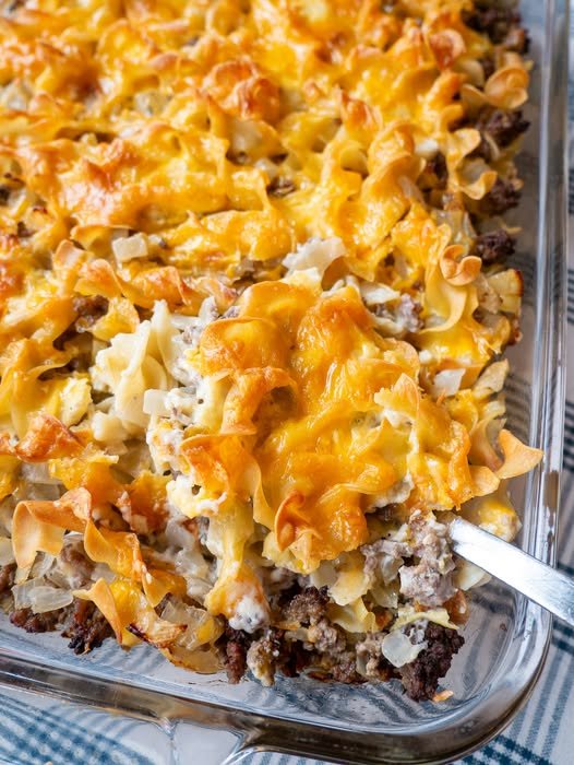This casserole is a comforting, savory blend of ground beef, noodles, and onions, all held together with a rich, cheesy egg custard. It’s straightforward, satisfying, and perfect for a family dinner.