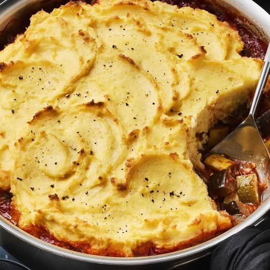 This dish replaces the traditional meat layer with a rich, savory ratatouille base and is topped with a creamy Parmesan mashed potato crust.