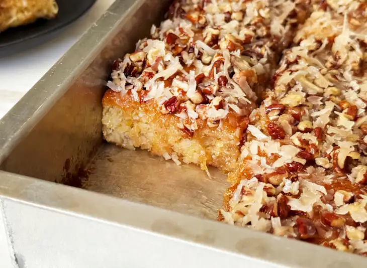Cool and Serve: Let the cake cool in the pan for at least 15-20 minutes. Then, run a knife around the edges and carefully invert it onto a serving platter or cutting board so the pecan-coconut topping is on top. Serve warm, ideally with a scoop of vanilla ice cream.